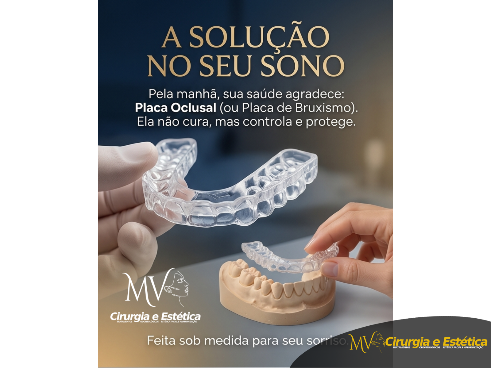 Na MV Cirurgia e Estética, cada placa é feita sob medida para o seu sorriso, garantindo conforto e máxima eficácia.